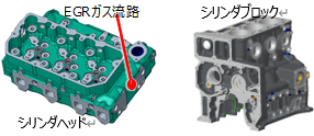 整備性およびコスト改善整備性およびコストが現行エンジンの課題であることから、設計検討段階から社内各部門並びにユーザ調査を行った上で、日常点検項目であるフィルタ類の配置の最適化を行い、エンジン本体も部品集約を行った。例として図5に示すようにシリンダヘッドには現行機では別個の部品であった吸気マニホールド、ロッカ―ケース、EGRガス流路の機能を持たせた。また、シリンダブロックにはギアケース、水ポンプケースの機能を持たせた。こうした機能集約による部品低減、補器配置最適化、ならびに56kW未満をターゲットとした補器容量最適化によって現行機比30%のコスト低減を実現した。