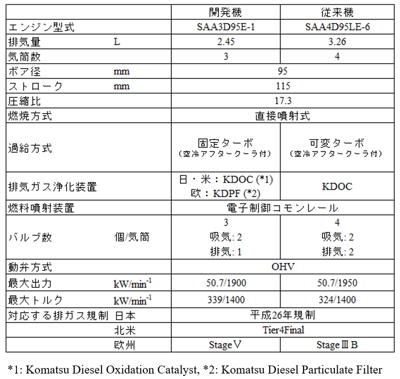 コマツでは排気量3.3~78Lまでの産業用ディーゼルエンジンを開発・製造している。3.3Lエンジン(4D95エンジン)は43~90kWまでの広いレンジをカバーする一方、7トン油圧ショベルの主戦場である56kW未満の出力レンジ用のエンジンとしては排気量過大であり、燃費やコストの面で競争力が低い。このため、車両全体としての競争力向上のため、車両コンセプト段階からエンジンへの期待項目をゼロベースで検討し、約30年ぶりに新モデルとして3気筒2.4Lの3D95エンジンを開発し7トン油圧ショベルに搭載した。コマツエンジンの特長である耐久性を落とすことなく競争力の高いエンジンとなったので紹介する。