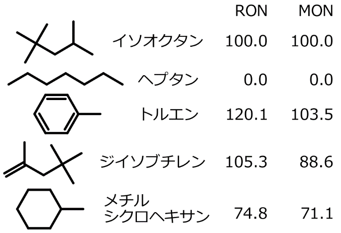 SIPサロゲートはガソリンの燃焼特性を再現することを目的とした。燃焼特性の一つは燃料-空気混合気の自着火性であり、耐ノック性(オクタン価)に強く影響する。もう一つは燃焼速度であり、等容度や燃焼効率、燃焼安定性などを支配し、耐ノック性にも関係する。このような燃焼特性は成分炭化水素の種類により変化するため、サロゲートは図1に示す五つのガソリンの代表成分と、添加物 [ETBE (エチル-t-ブチルエーテル)・エタノール] から構成した。図には成分のリサーチ法オクタン価 (RON) とモータ法オクタン価 (MON) を示す(5)。測定法の異なるこの2種類のオクタン価の差(オクタン感度)も燃料の重要な指標と考えられており(6,7)、ジイソブチレンなどのアルケンや、トルエンなどの芳香族炭化水素で大きい。