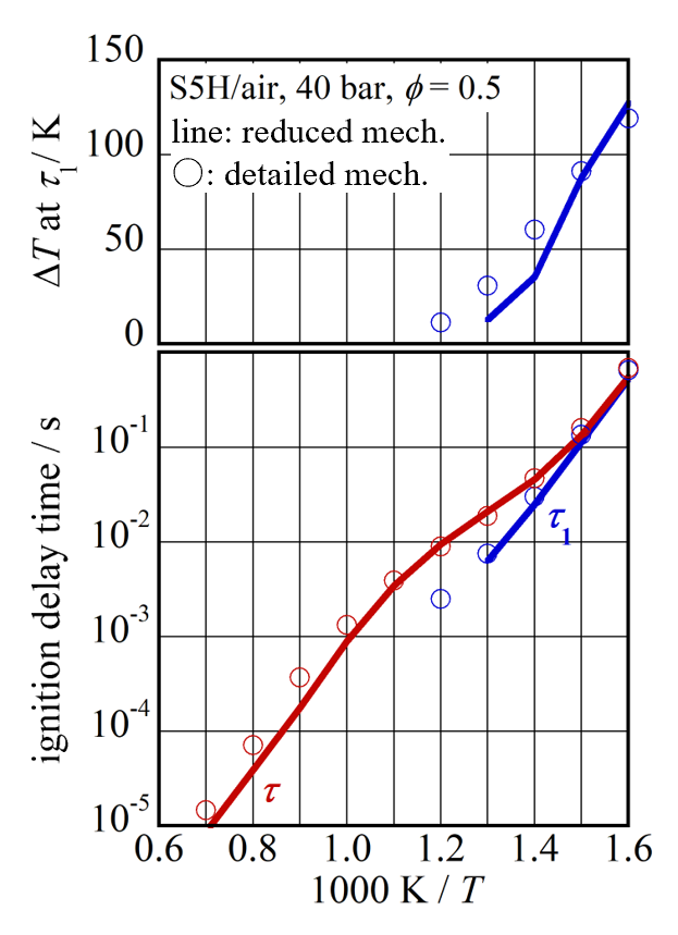 詳細反応機構トルエンを除く4成分の燃料の交差反応を含む詳細反応機構は、反応機構の自動生成システムKUCRS(8,9)によって生成したものが元になっている。これにトルエンの詳細反応機構(10)を結合し、さらに小倉によるETBEの反応機構(11)と、交差反応が追加されている。反応機構はそれぞれの成分燃料の基礎燃焼特性(衝撃波管による着火遅れ時間と燃焼速度)に対する検証と改訂を経て、最終的にサロゲート混合物に対する検証を行っている。図2にハイオクガソリン相当のサロゲート(S5H)の例を示した。シンボルが衝撃波管実験による着火遅れ時間(12)であり、実線が反応機構を用いた計算結果である。