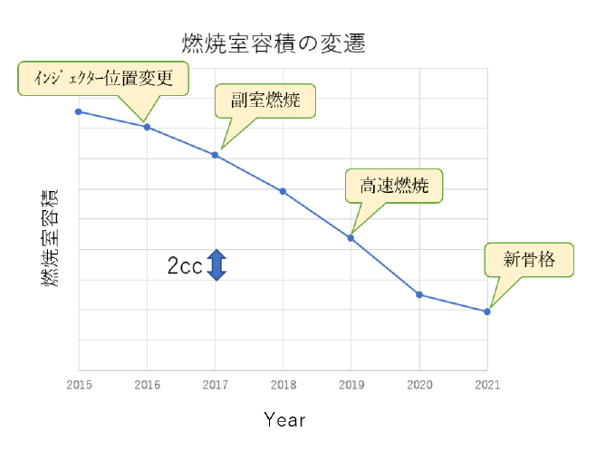 2018年シーズンが終わった。マクラーレンとの関係を解消し、新たにトロロッソと組んだ初めてのシーズン。兎に角必死で設計リーダーの任に当たった。それまでの数年間に比べれば手応えを感じるとともに、トップチームとの差を思い知らされた。来るべき勝負のために、全く新しいPUの構築が必要だった。総勢8名。少数精鋭の設計/計算検討チームが編成された。まず最初に取り掛かったのは燃焼室の設計である。全く新しい、高速燃焼と呼ばれる燃焼を手の内に入れつつあった。また圧縮比もレギュレーションの上限である18.0 : 1が視野に入っていた(図1)。これらに最適化させた燃焼室とはどんなものなのか。おぼろげながらにイメージは持っていた。それを3Dモデルにし、計算を駆使しながら細部形状を構築した。バルブの挟み角も高さも、スパークプラグの位置も角度も、インジェクタ配置もすべてを変更した。何度も寸法の調整はしたが、基本的なコンセプトに関しては迷いがなかった。「これが一番良いはずだ」という確信があった。皆が同じイメージを共有していた。