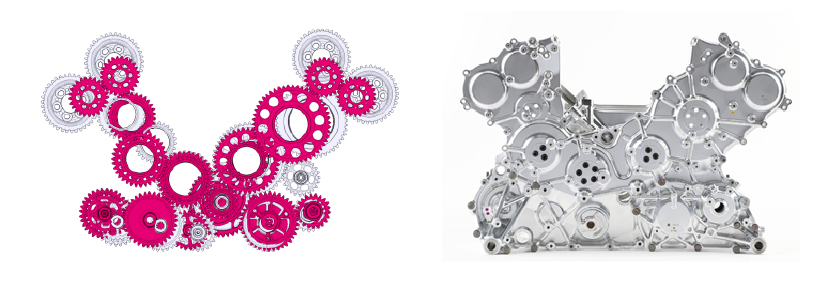 動弁とレシプロを形作る燃焼室(およびピストン冠面)の設計指針が決まり、周辺の動弁機構(図2)、レシプロ機構の設計に取り掛かると、一気に問題が噴出する。ここからが設計の腕の見せ所。あちら立てればこちら立たずという状況をどう高次元でバランスさせるのか? 例えば各部分の要求を並べてみると、バルブ径はなるべく大きくしたい、燃焼室はなるべく凹凸をなくしたい、プラグは真ん中に置きたい、ポートはなるべく曲げたくない、といった具合に各機能部位の要望を並べても、全く現実的な形は見えてこない。かといって、安易に過去のPUの寸法を真似することはしたくなかった。それが正しいとは限らないからだ。理詰めだけでは設計はできない。発想力がものをいう世界でもある。上記以外にも様々な折り合いの問題がある。これらの折り合いをつけるためにラフなモデル構築をしたり、計算をしたり。どうやってゴールに向かうか。どうやってリアルワールドにPUを産み落とすか。この部分を担うのが設計なのである。意外に思うかもしれないが、新骨格設計において、燃焼室周辺で最も頭を悩ませたものの一つがヘッドスタッドの配置と高さである。この折り合いをつけるために今までにない形状を設計し、加工方法も変えた。これら多くの構成部品が、納得できる折り合いを見つけることができたという達成感。外の方には理解されにくいかもしれないが、この瞬間が一番設計者らしい喜びを感じる瞬間である。