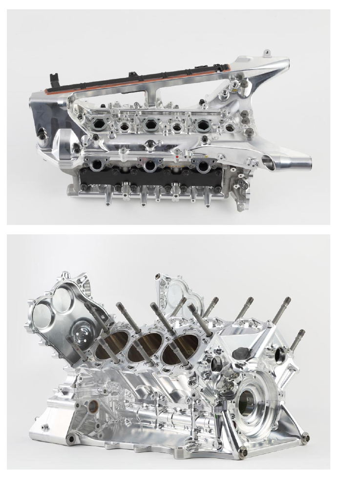 完成した新骨格と旧骨格比較写真(図4)にて、プレナムチャンバ配置および形状、カムカバー周りの剛性バーやフロントマウント周辺の造形、ウエストゲート配置、等がパッケージのために大きく変更された部位として確認可能である。