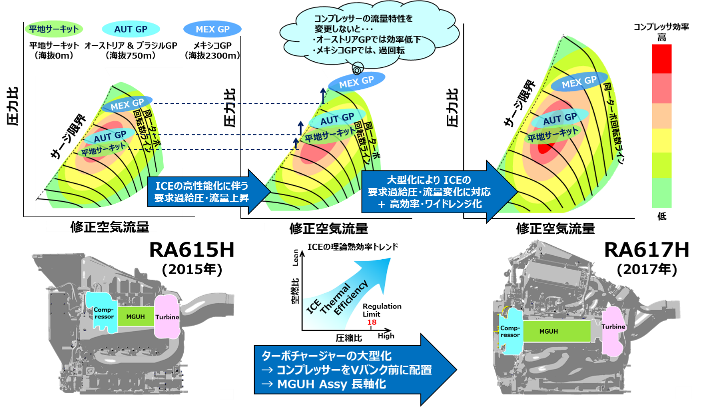 ICEの高効率化、高出力化を達成するために必要な空気流量と過給圧は飛躍的に増加した。 この要求に対応する手段は、ターボチャージャの大型化であり、2016年までV6エンジンのVバンク内に配置されていたコンプレッサをVバンクの前側に配置する必要があった。 この対応に伴い、コンプレッサとタービンをMGU-H(Motor Generator Unit-Heat ; ターボでの排熱回収を主目的とするモータ発電機)を介して接続する軸は大幅に延長され、ローターダイナミクスが新たな課題となった。 我々は、オールホンダのシナジーにより、この技術課題を克服し、コンプレッサ、およびタービンの性能向上と、MGU-Hの高出力化などにより対他競争力を向上させた。