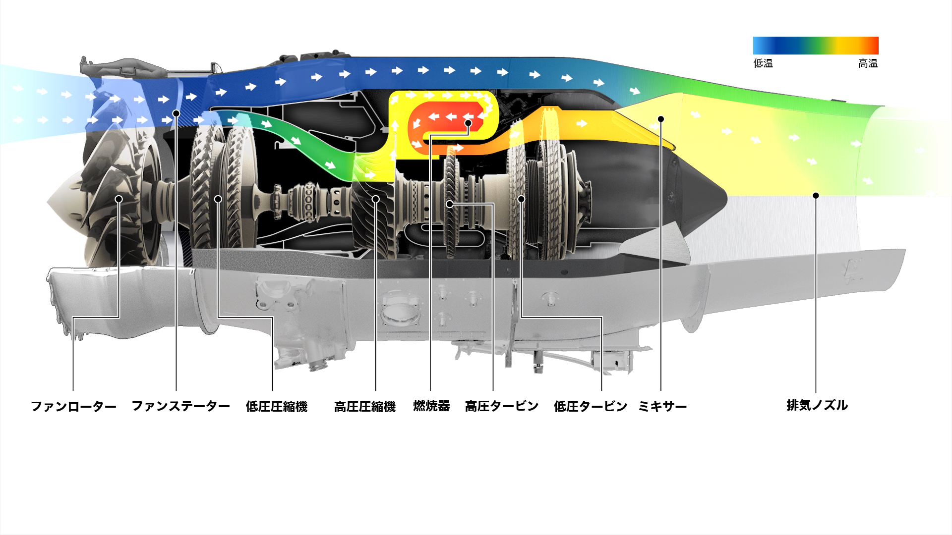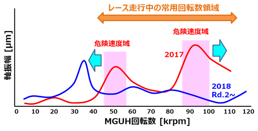 2017年に採用した長軸化したターボ+MGU-H(以下MGU-Hアッシー)に対して、それまでとほぼ同じ軸受けと軸構造を継続採用した結果、レースでの常用回転数領域に軸挙動が不安定になる危険速度域が存在していた。 テストベンチでの試験では、静的な軸の振れやアンバランス量の調整により、MGU-Hアッシーの軸挙動に大きな問題は発生しなかったため実戦投入を判断した。 しかし、実走現場に於いて不具合が多発し、幾度となくレースをリタイヤする原因になってしまった。 後の解析により、これはテストベンチでは発生しない車体側からの外乱、即ちサーキットのコーナー部分などに設置されている縁石の段差を乗り越える時に発生する振動が、危険速度域で運転中のMGU-Hアッシーの軸振動を増幅させていることが原因だと判明した。この問題の解決に対しては、長軸の航空機用ガスタービンエンジン(図2)の軸振動解析と対応について知見がある社内のエアロエンジンセンター*1に協力を仰いだ。 その結果、軸受けの支持剛性、ベアリングサイズ、潤滑方法、および軸構造が大幅に見直され、図3に示す様にレースでの常用回転数域から危険速度域を外すことに成功し、2018年の第2戦に実戦投入されて以降、同様の不具合発生は皆無になった。