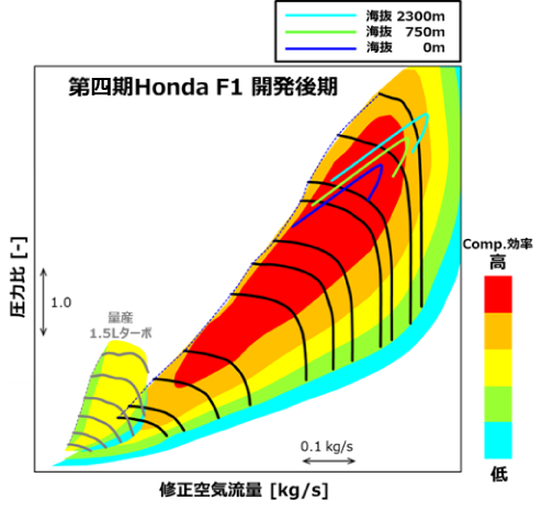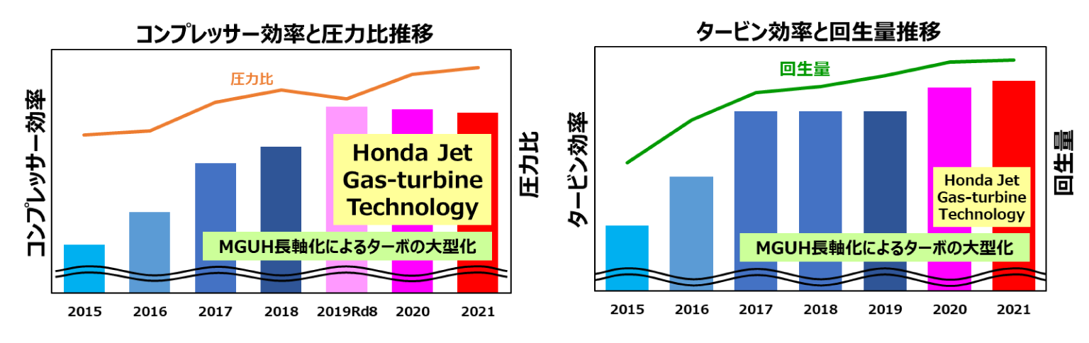 ターボチャージャに対する要求性能への対応図4に示す様に、ターボチャージャに求められる要求圧力比と流量は、自動車用ターボチャージャのレベルからガスタービンレベルに上昇していった。 一方で、エンジンの高効率化により排気エネルギー、即ちタービン流入エネルギーは減少するため、図5に示す様に限られたタービン流入エネルギーからより多くのMGU-H回生量を得るには、タービン、およびコンプレッサの効率改善が重要になる。 これらの要求性能を満足させる為に、2019年までのターボチャージャサプライヤーによる技術的サポートから、ホンダジェットの航空機用ガスタービンエンジン技術の導入に踏み切った。