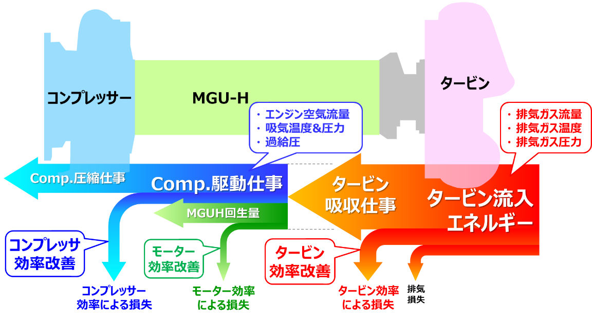 過給エンジンにおいて、ターボチャージャはエンジン出力特性を左右する重要な機能部品であり、特に現在のF1レギュレーションでは、エンジンからの排気エネルギーをタービンで吸収し、コンプレッサでの過給仕事とMGU-Hでの回生エネルギーとして使うため、高性能なコンプレッサ、タービン、およびMGU-Hが必要になる。 また、これらのコンポーネントを安定して高回転で運転し続けるためには、MGU-Hアッシーの軸振動特性に関する対応も重要である。 限られた時間でこれらすべての要求性能を高い耐久信頼性と共に満足させることは大きなチャレンジであり、開発サイドのエンジニアにとってF1レースとは技術開発競争そのものである。