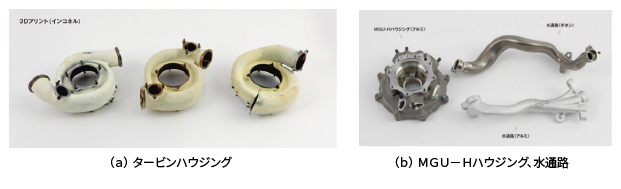 ターボチャージャの開発スピードアップエンジンの燃焼開発が進むとターボチャージャに対する要求性能も変化するため、燃焼開発と同時並行でターボチャージャの開発を進め、開発スピードの向上を図った。 また、物造りの点においてもオールホンダのシナジーを活用し、社内の試作部門の協力により、3Dプリンターによるインコネル製タービンハウジングやMGU-Hハウジング(図6)の製作を可能にすることで大幅に主要部品の納期を短縮した。 これにより、空力設計→CFD→単体性能評価によるフィードバックのループを高速化し、現物による性能、および耐久信頼性の確認をエンジンの燃焼開発と同時期に完了させ、F1パワーユニット開発に求められる時間的な要求に対応した。この結果、図7に示す様に、年々コンプレッサの圧力比の上昇と共に、コンプレッサ、およびタービン効率を向上させ、結果的に回生量も年々増加させることが出来た。