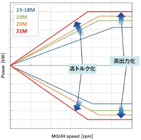 MGU-Hの高出力化ターボチャージャ、およびMGU-Hでの回生エネルギー取り切りに向けた展開として図8に示す様に、2019年以降にMGU-Hの高出力化、および高トルク化を推進した。 これは、MGU-K*2と異なりF1レギュレーションにおいて出力制限が無いMGU-Hでの全開加速中の回生量の向上に加え、MGU-Hを介したMGU-Kとバッテリ間のエネルギーの迂回技術であるエキストラハーベストなどによる効果を最大化させるための取り組みでもある。 具体的には、磁束密度の高い磁石の採用、熱伝導率の高い絶縁体の採用によるモータ冷却効率の改善などによりMGU-Hの高出力化、高トルク化を達成し、対他競争力を改善することが出来た。