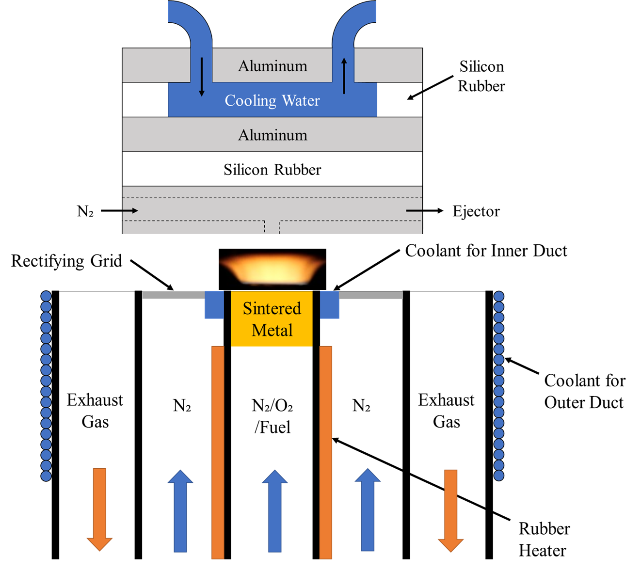 ところで、本研究ではAICE-PM/PNサロゲート燃料を実験対象としており、その中には高沸点成分も含まれている。また、本研究では予混合火炎を取り扱うとともに、すすの研究であることから過濃条件を対象としている。酸素よりも分子量の大きな燃料の場合、過濃条件ではルイス数の影響によって火炎が不安定になりやすい。そこで、BSS火炎実験装置では焼結金属を用い、予混合火炎をその近傍に保持することで、逆火を防ぎつつ定常的に安定な火炎を形成している。この場合、火炎が焼結金属近傍に存在することから、部材の温度が高くなりやすい。その温度を、用いた焼結金属の使用温度(例えば300℃程度)以下に冷却しつつも、通過する燃料が凝縮しないように沸点(例えば170℃)以上に温度を保つ、この温度管理が非常に難しかった。焼結金属を使用したバーナには、標準品として市販化されたものもある(McKenna burner)。この製品では焼結金属中に冷却管を埋め込んであり、冷却は比較的容易である。一方で、冷却管近傍をガスが通過するときに燃料が凝縮することが懸念された(同等の形式での予備実験で、凝縮を確認)。詳細は紹介できないものの、本実験条件を達成するために、装置の設計製作は研究担当者が主となり、学内の工場で指導を受けながら加工した。さらに、県内の特殊加工を得意とする企業や同様の装置を有する海外の研究者と連携して知見を得ながら装置を完成させた。最後に、技術者として基本的なことではあるものの、実験前の暖気や細かい準備を毎回しっかりと行い、実験値を取得することができた。