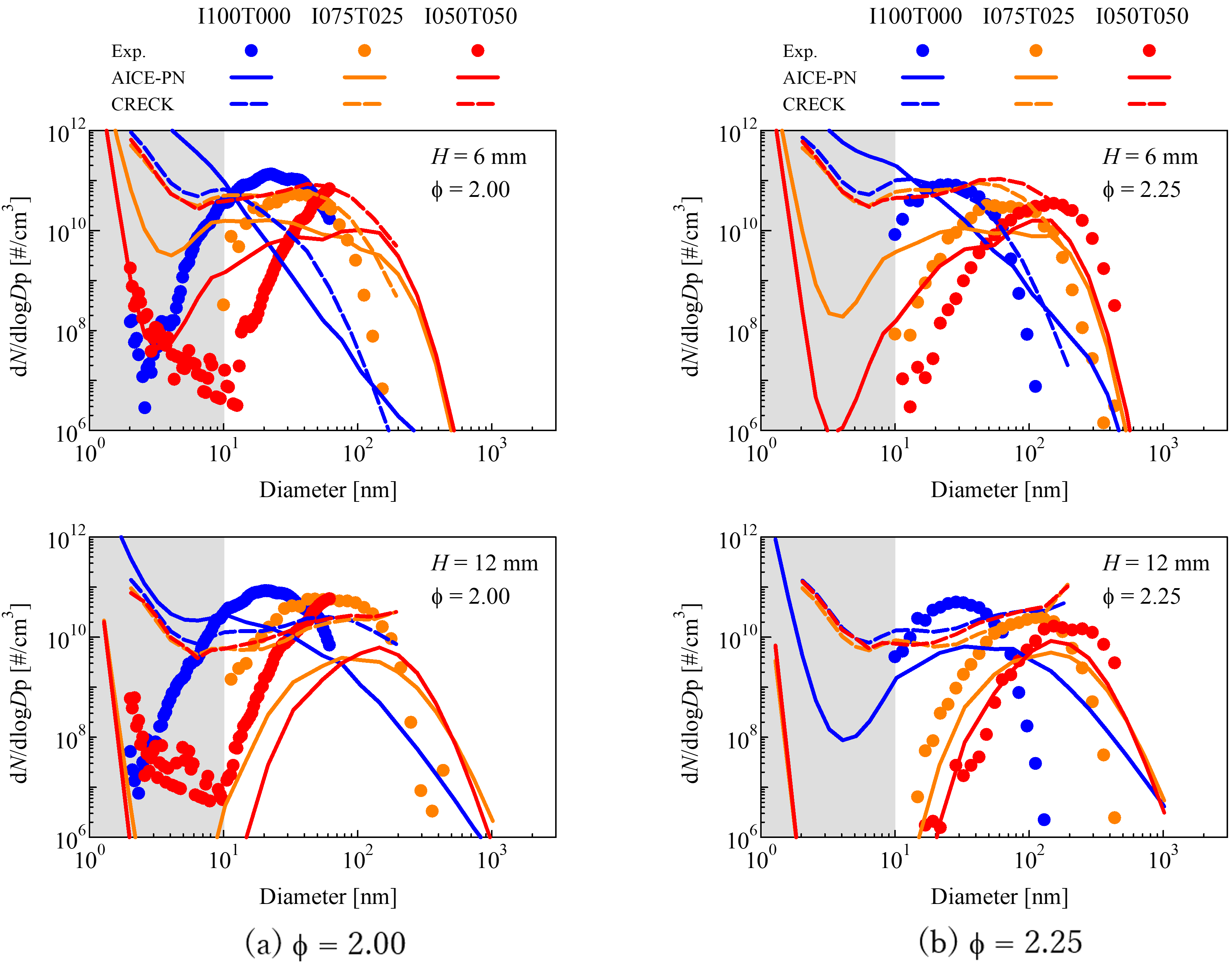 図3に、イソオクタン/トルエン混合燃料条件に対するモデル計算結果を、実験結果とともに示す。実験条件名のIはイソオクタン、Tはトルエン、その後の数字は混合割合を示す。また、AICE-PNモデルが提案モデル、CRECKは文献モデルである。なお、図中の灰色領域はPAMSの計測範囲外を表す。当量比2、I075T025およびI050T050条件については、実験中にPAMSに不具合が生じたため、TSI SMPS model 3938を用いて計測を行ってある。詳細は既報(7)等に譲るものの、このような実験結果に基づき、噴霧・蒸発モデルに依存しないPNモデルの検証を行うことができた。