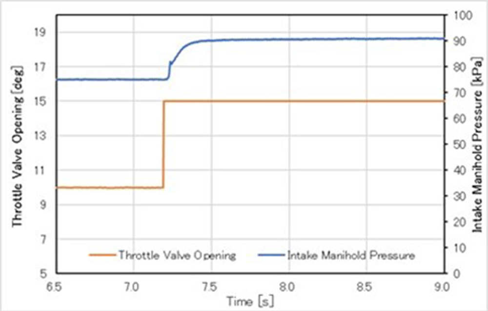 2022年度に東大のエンジンベンチで行った共同実験は、慶大、熊大、東大の教員および学生で行われた。この実験は、先に吸排気の制御系を検討していた慶大、熊大の制御器のキャリブレーション用のデータ取得を目的とした。具体的な実験内容は、スロットル開度およびEGRバルブ開度をステップ変化させた際の吸排気系の応答の確認である(図2)。図3は実験の際に、ベンチの動作やデータの取得について、著者が他大学の教員、学生に説明を行っている様子である。