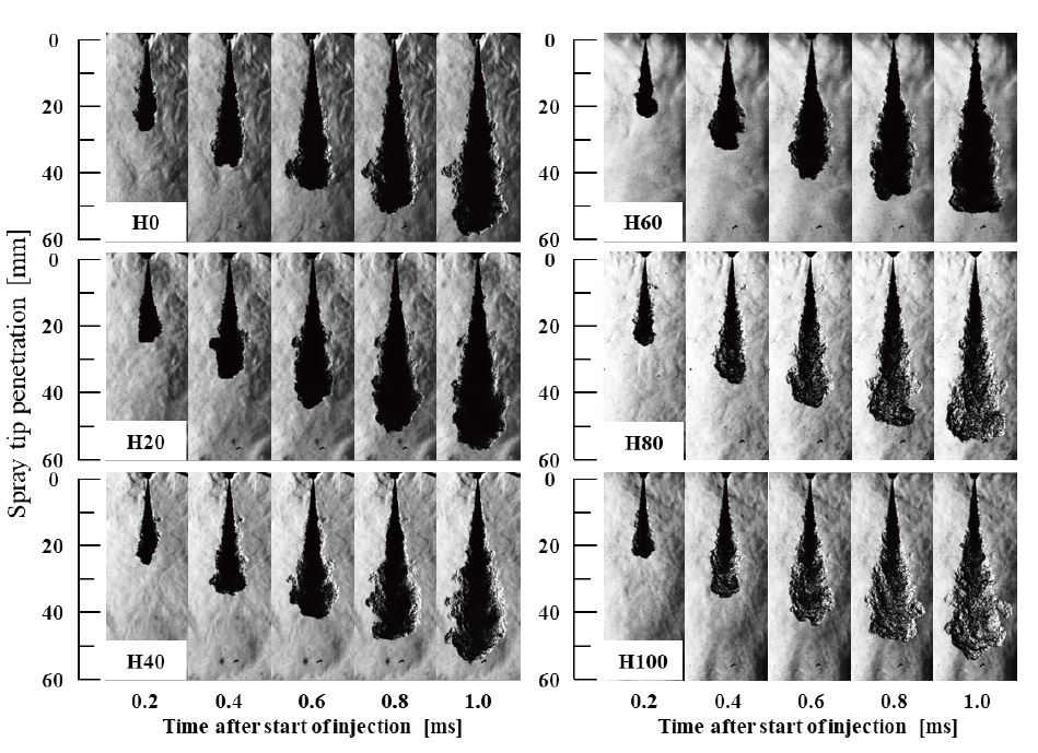 従来から使用されているバイオディーゼル燃料である脂肪酸メチルエステル(FAME:Fatty Acid Methyl Ester)は動植物油を原料に比較定期容易に製造できるものの、高級不飽和脂肪酸で構成されるため軽油に比べて酸化安定性や低温流動性が劣る。そのため近年では動植物油を水素改質することによって得られる水素化バイオディーゼル(HVO:Hydrotreated Vegetable Oil)が生産されており、軽油と遜色ない特性を持つことから100%で使用することも可能であるが、まだ大量には生産されていない。そこで同志社大学の越川らのグループ(1)は、「水素化バイオ燃料を混合した脂肪酸メチルエステルのディーゼル噴霧・燃焼特性」と題した発表で、従来から使用されているFAMEにHVOを混合して利用することを検討している。