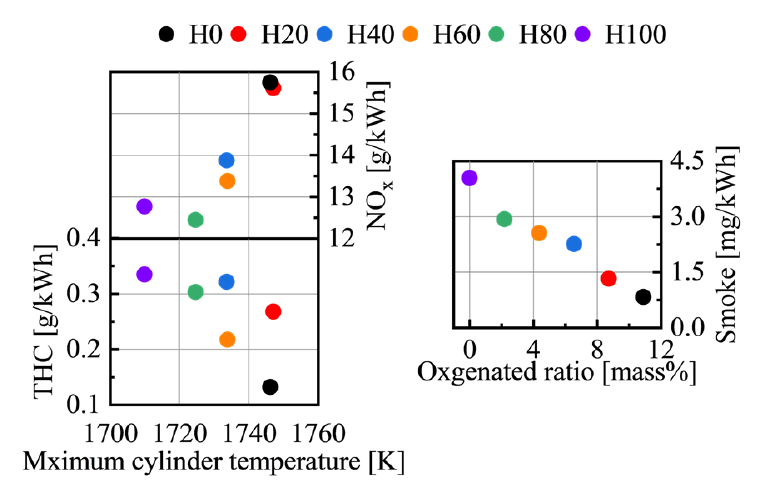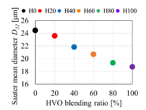 HVOはFAMEに比べて低沸点であり、低動粘度,低表面張力,低密度となっている。そのためHVO混合比率の増加に従って噴霧液滴の微粒化が促進されザウタ平均粒径D32が約25%減少している(図1、2)。この結果、着火遅れ時間が減少して予混合性が低下したことから燃焼による筒内最高温度が低下し、NOxがFAME100%に比べて最大19%低下することを示した(図3)。