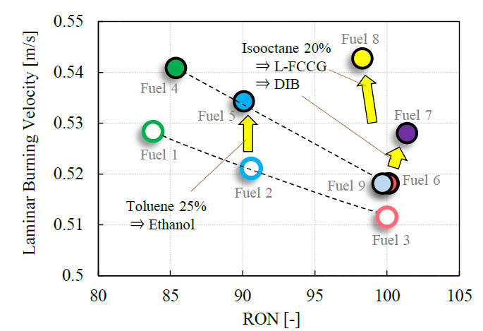 松原ら(2)は「自動車の早期低炭素化を実現する内燃機関/燃料組成の開発」と題した発表で、国立研究開発法人 新エネルギー・産業技術総合研究機構(NEDO)の委託研究成果を報告している。本テーマは科学的裏付けに基づいたガソリンエンジン燃焼に適した燃料組成の開発と、燃料の特性を活用するためのエンジン技術の開発によって、ガソリン用過給シーンバーンの熱効率向上とエミッション低減に挑戦することを目的としている。