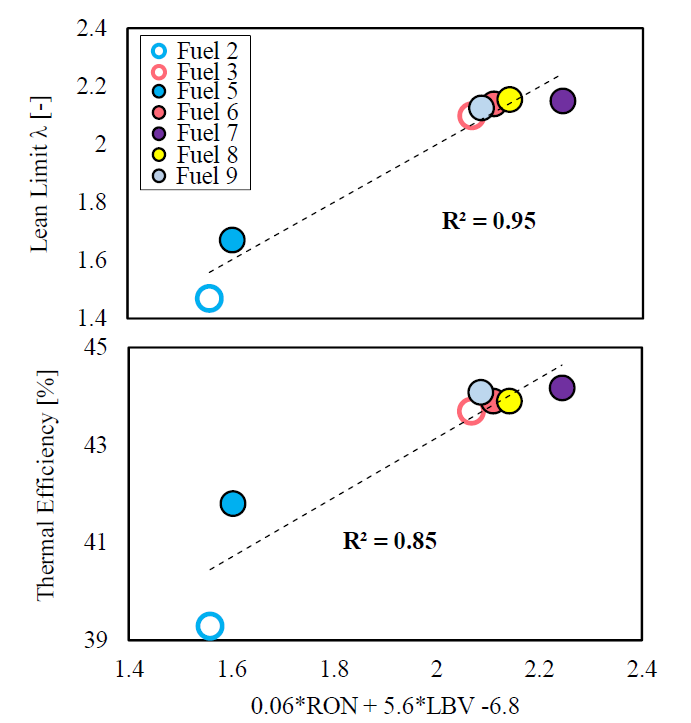 北野ら(3)は「スーパーリーンバーンエンジンにおける燃料組成が熱効率に及ぼす影響」と題した発表で、空燃比λ≧2を実現するスーパーリーンバーンエンジンを用いて、燃料が熱効率やエミッション、ノッキングに与える影響を検討している。評価燃料として現在の製油所で製造可能な、主にC5,C6の炭化水素で構成されたオレフィンを多く含む燃料を基に、エタノール、ETBE、芳香族などの混合量を変えた14種類の燃料を用いた。