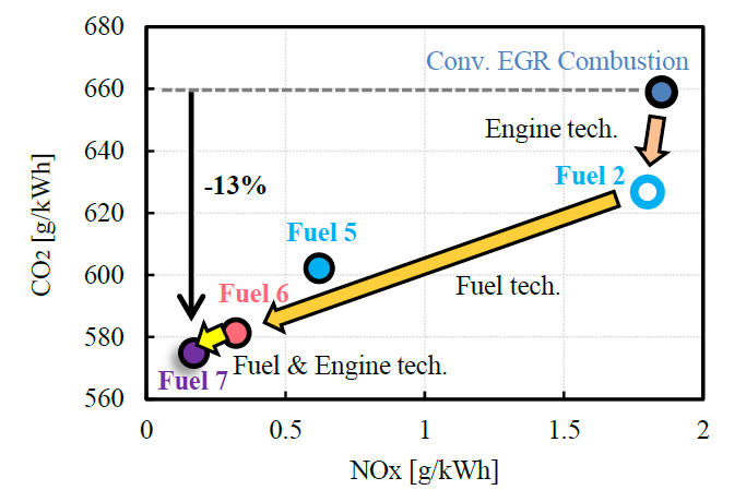 その結果、軽負荷におけるリーン限界は着火から10%燃焼割合までの燃焼期間SA-10%と相関が高いことがわかった。一方、高負荷におけるリーン限界はRONと層流燃焼速度(LBV)を用いた回帰式と良い相関を示すことを示した(図5)。最高熱効率点は、より高負荷までエンジンを運転できたポイントで得られた。さらに低エミッションの観点からNOx排出量と、GHG削減の観点からCO2排出量の関係を評価した結果を図6に示す。エンジン回転と負荷、適合の見直し、着火性の改善や残留ガス活用などのエンジン技術との組み合わせにより、NOx19.8ppm(0.17g/kWh)で最高熱効率45.03%を達成し、CO2排出量は従来燃焼比で13%低減することを示した。