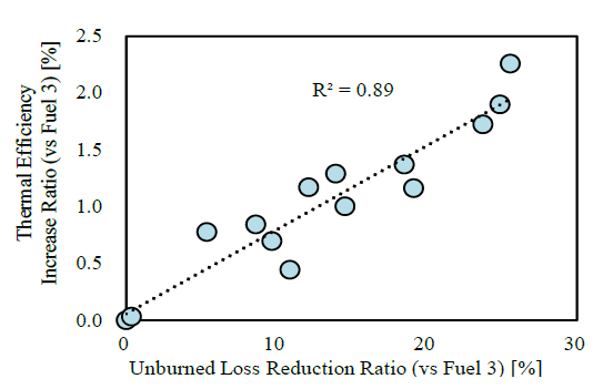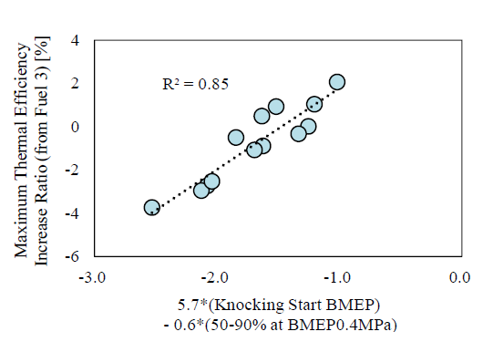 その結果、低負荷条件では未燃損失の低下に伴って熱効率が増加することを示しており(図7)、C5,C6の炭化水素でかつオレフィンを多く含む燃料が優れていることを明らかにした。また未燃損失は50~90%燃焼期間(CA50-90)に相関しており、さらには層流燃焼速度と相関が高いことを示している。一方、最高熱効率はノッキングが始まるBMEPとCA50-90とからなる回帰式と相関が高いことを示し、最高熱効率の向上にはノッキング耐性と燃焼速度が速いことの両方が重要であるとしている(図8)。以上の結果を基に車両走行モードにおける熱効率を想定する(図9)と、高負荷を多用するハイブリッド車(HEV)においてもWLTCモードのエネルギー効率を向上するためには、燃料のノッキング耐性の向上と燃焼促進の両方の効果が需要であるとしている。