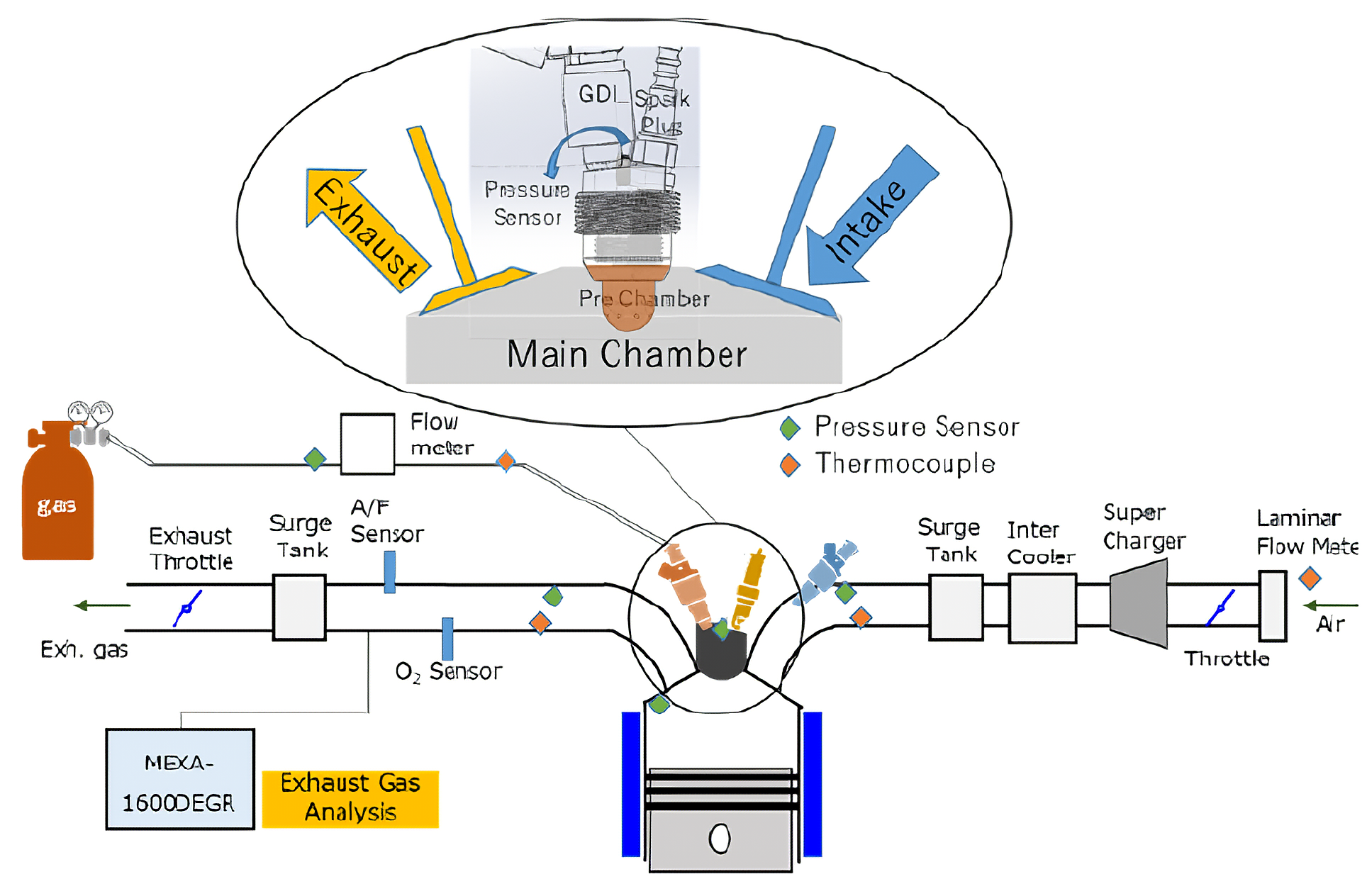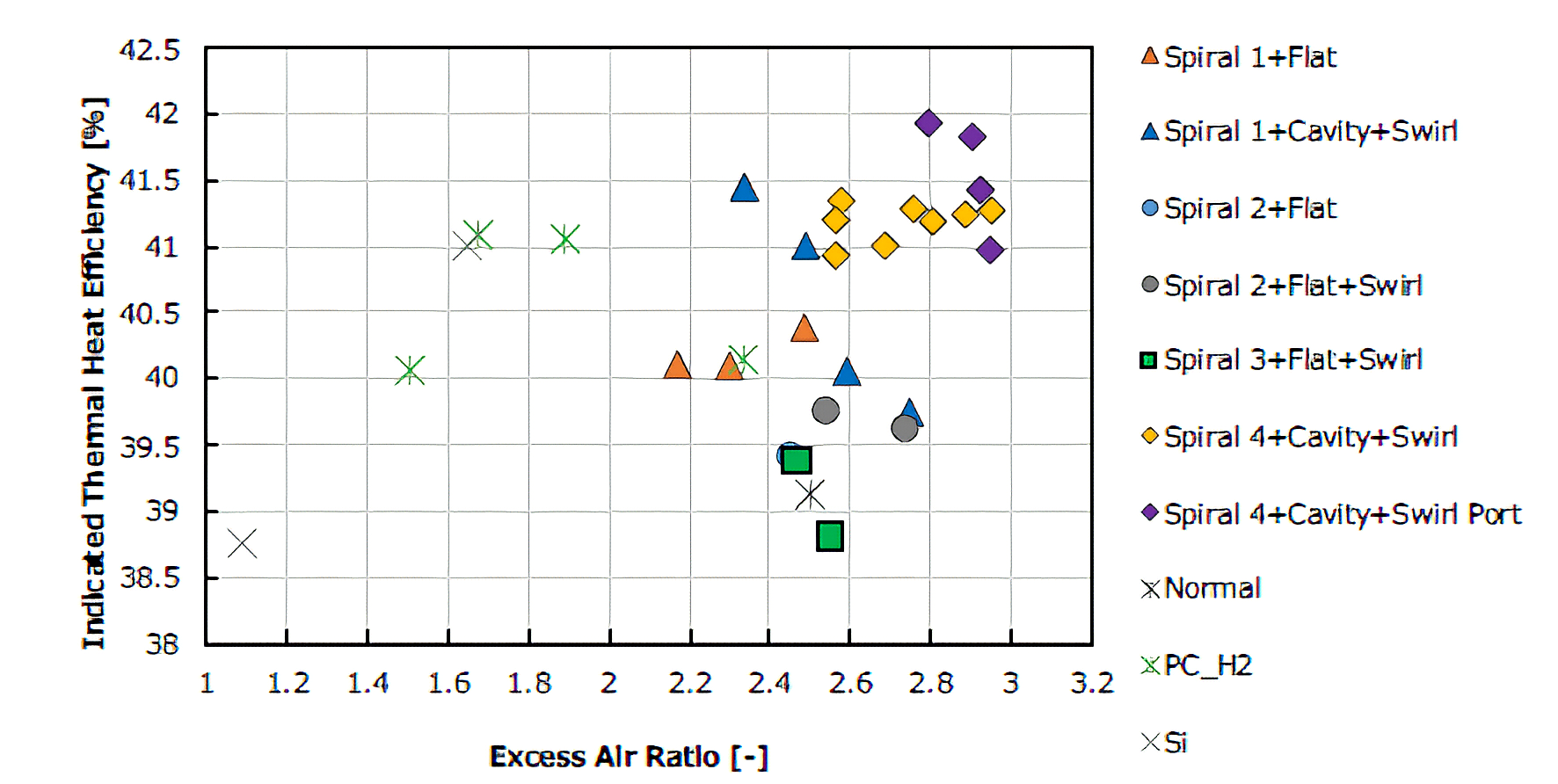 沈ら(1)は副室を持つ単気筒エンジンで実験を行った。実験装置の概観を図1に示す。副室内には燃料改質ガスを模擬したガスの噴射弁と点火プラグを備えている。副室の容積とノズルの寸法・形状を変化させて希薄燃焼における熱効率の向上とNOx排出量の低減効果を確認した結果、副室と主室の最大圧力差ΔPを大きくすることが主室の燃焼改善に有効であることを見出した。選定した副室仕様はスパイラル形状の噴口で、噴口径はジェットを強めるために絞り、副室容積を小さくしたものとなった。これに副室ジェットと干渉しにくいキャビティピストンを組み合わせてスワールを利用することでリーン限界をλ=3まで拡大し図示熱効率42%とNOx排出0.1ppm以下を実現できた(図2, 図3)。