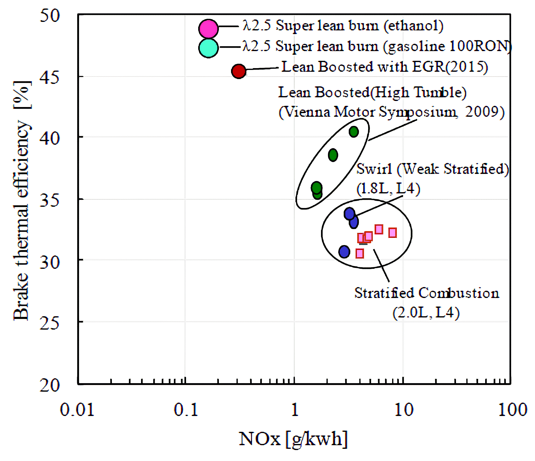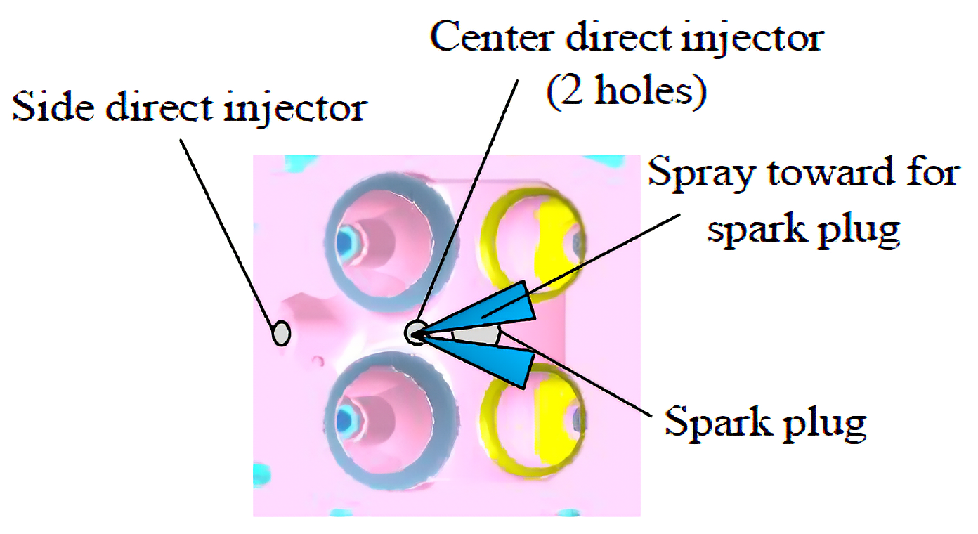 木村ら(1)は、高い熱効率と後処理が不要となるレベルの低NOxの実現を目指し、空気過剰率λが2.5を超える希薄混合気の安定燃焼を実現した(図1)。ロングストロークや高タンブル(タンブル比4)の採用による筒内流動の強化と合わせ、二つの直噴インジェクタを用いて点火栓近傍に弱成層した混合気形成を行い(図2)、均質混合気に対して大幅に希薄燃焼限界を拡大している。また、希薄化に伴う未燃HCの増大をクエンチが生じる燃焼室狭小部を削減することにより低減している。本報では外部過給を用いて評価を行っているが、今後、高効率な過給機と組み合わせた技術実証が期待される。