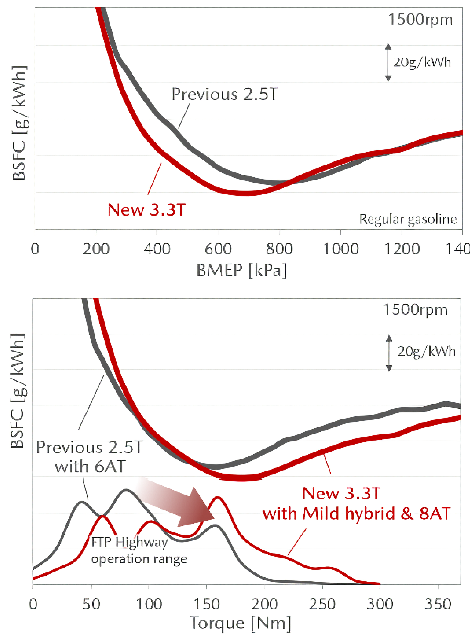 山口ら(2)は、新型3.3L直列6気筒エンジンについて紹介した。本エンジンは、同排気量のディーゼルエンジンとボア、ストロークの基本諸元を共通化している。ミラーサイクルを採用することにより、過給エンジンとしては、高い圧縮比12としている。既存エンジンに対し、排気量を拡大することにより高いトルク領域での燃料消費を実現した(図3)。吸気流動強化、燃焼室形状の改善により全域にてEGR(内部および外部)を導入し、マイルドハイブリッド化や多段変速機によるエンジン運転領域シフトを行っている。また、モータ駆動域拡大をねらった電力確保のために、燃焼による始動アシストを採用していることも技術的なトピックスとなっている。