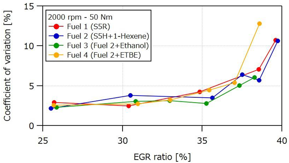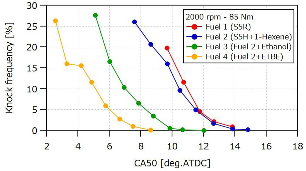 プレミアムガソリンの5成分サロゲートであるS5Hを基準燃料(Fuel 1)とし、そこに1-ヘキセン(オレフィン)を40 Vol.%混合した燃料(Fuel 2)、Fuel 2にエタノールを10 Vol.%混合した燃料(Fuel 3)、Fuel 2にETBEを 23Vol.%混合した燃料(Fuel 4)の4種類の燃料を用いて、EGR限界、希薄限界、ノック特性などを調査した。使用したエンジンは、圧縮比14、総排気量1490cm3の3気筒直噴自然吸気エンジンと、圧縮比10.4、総排気量1795cm3の4気筒ターボ過給エンジンである。EGR限界を調べた結果, オレフィンおよびエタノール混合燃料は希釈限界が伸びる傾向にあった(図1 (前刷の図1))。これは、オレフィンとエタノールが、層流燃焼速度がイソオクタンヤトルエンに比べて大きく、かつ分子量が小さいためルイス数が小さいため、消炎に対して安定であると考察されている。層流燃焼速度と分子量がイソオクタンと同等であるETBEを混合した場合には、そのような効果は認められなかった。なお、ノック抑制効果は、エタノールおよびETBEを混合した燃料で見られる(図2 (前刷の図5))。
