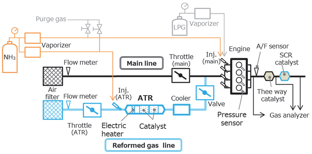 竹内らは(1)-(3)、アンモニア単一燃料を用いたエンジン研究を発表した。難燃なアンモニアを直接燃焼させずに、アンモニアから補助燃料である水素を、オンボード改質器を用いて取り出して燃焼させたことが独創的な発想である。システム構造を(図1)に示す。
