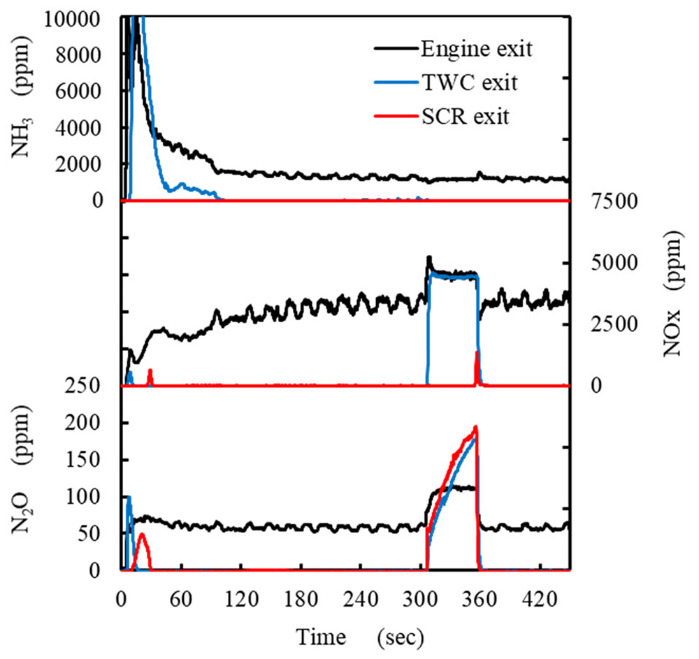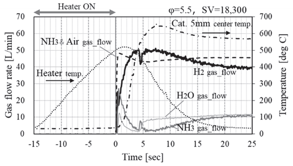 1報では改質器を予熱することでアンモニアと空気の混合気を供給後ただちに水素が供給されること(図2)、直列4気筒産業用エンジンの運転範囲を概ねカバーできることを示した。2報ではエンジンシステムをトーイングトラクタに搭載して評価を行い、LPG利用より出力は20%程度低下するが牽引能力含め大きな問題ないことを確認した。3報では冷間始動においても適切にλを制御することで、テールパイプからアンモニアの排出させずにNOx,N2Oを低いレベとできることを実証した(図3)。輸送機器のカーボンニュートラルに向けた多様なエネルギーの利用方法として今後の展開を期待したい。