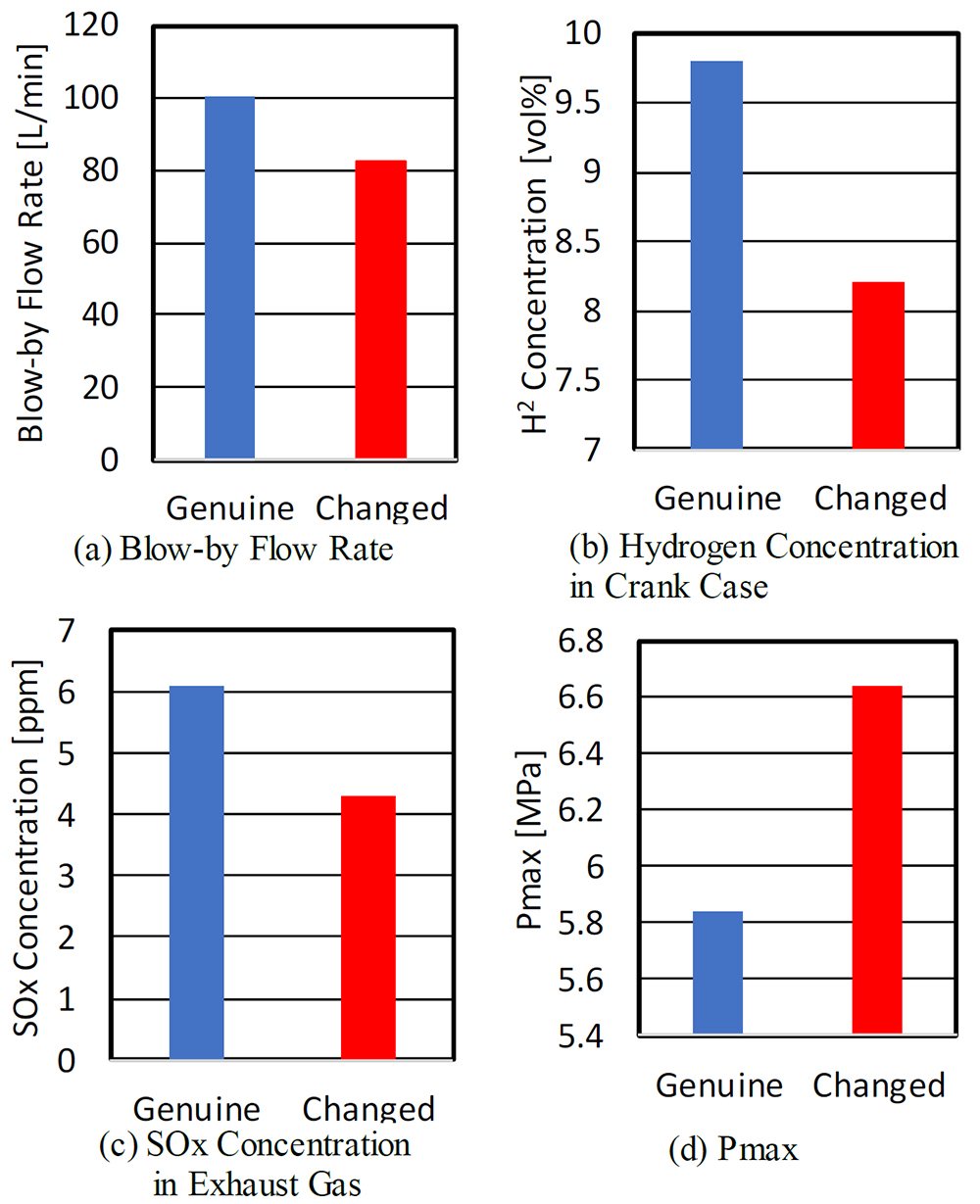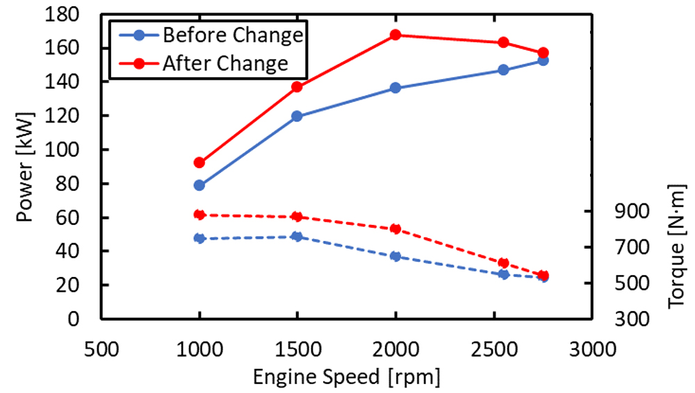 試験に用いたピストンリング形状はベースエンジンに対してトップリングの合口隙間を低減させ、スロットルの追加で発生する負圧によるオイル上がりを削減することを狙い3ピースタイプとした(表1)。 エンジン試験結果から、ブローバイガス流量の低減(図4(a),(b))、オイル消費の低減(図4(c))、Pmaxの向上を確認した(図4(d))。ブローバイガスの減少とオイル由来の異常燃焼改善の結果として運転領域全体で出力、トルクともに向上を可能とした。(図5)。