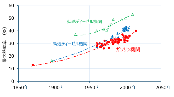 エンジンから排出されるCO2を削減させることは、正味熱効率を向上させることであり、内燃機関が発明されて以来、熱効率向上の因子(表1)を改善する絶え間ない技術開発を積み上げてきた結果、継続的に向上している(図1)。