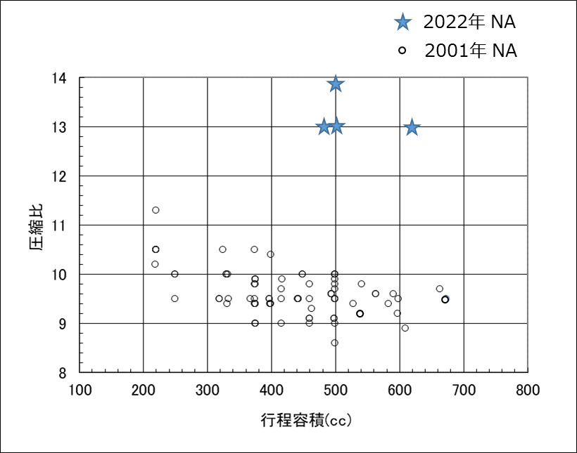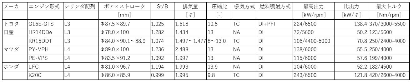ガソリンエンジンは、すべて筒内直接燃料噴射(DI or DI+PFI)であり、ストローク・ボア比(St/B)が1.2を超えるロングストロークエンジンもある。圧縮比は自然吸気エンジンでは13以上となっており、熱効率向上を目指して着実にスペックが改善している。圧縮比を約20年前のNAエンジンの平均と比べると3以上高くなっていることがわかる(図2)。