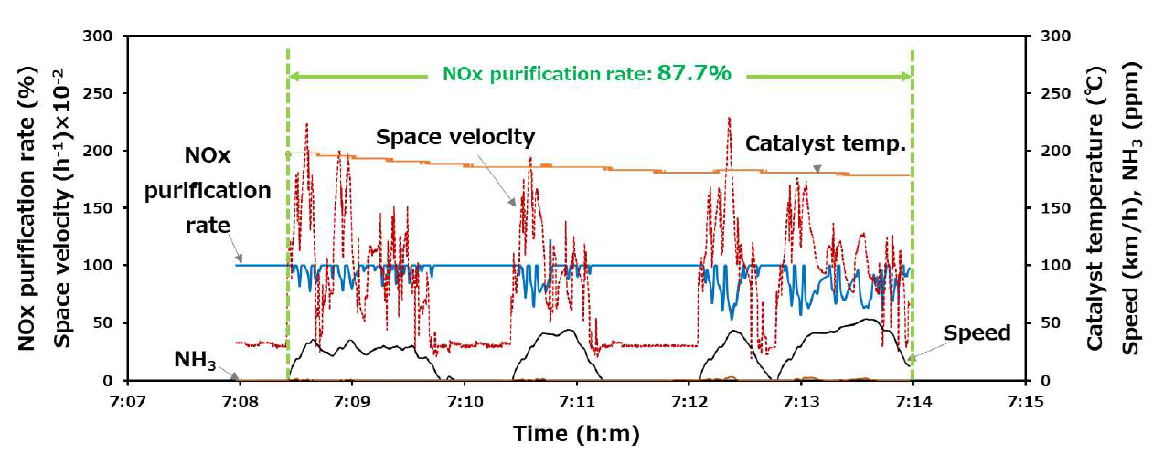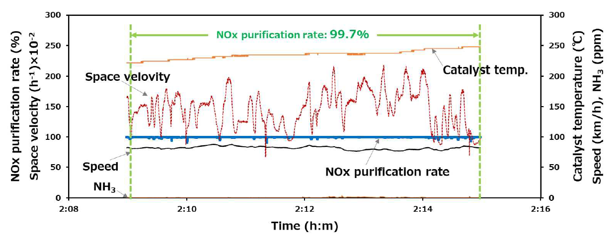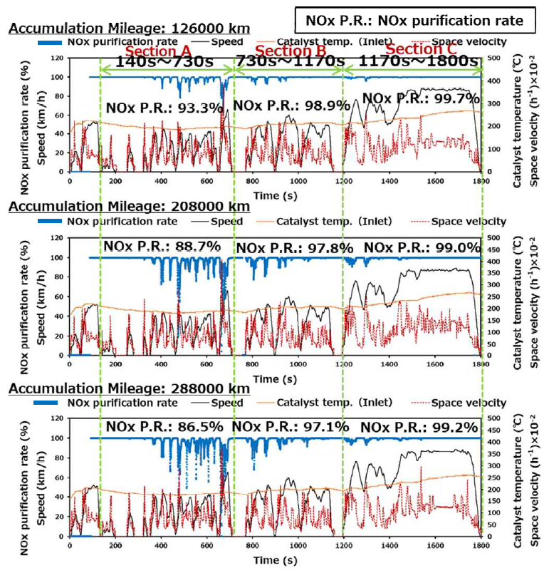 山本(1)は大型重量貨物車の使用過程における尿素SCRシステムのNOx浄化性能をシャシダイナモと路上走行の両方で評価した。路上走行のNOx測定は車両の排気管に取り付けたセンサを用いるSEMS方式で行った。図1は同一の試験車両で積算走行距離が12万km、20万km、28万kmのときに測定したシャシダイナモ上のWHVCモード走行結果を示す。図中にNOx P.R.と書かれたNOx浄化率は、加減速の多い区間Aでは積算走行距離が増加するとともに小さくなるが、モード後半の定常走行区間Cでは低下の度合いは小さい。図2と図3は同じ車両の積算走行距離28万kmにおける路上走行の結果であり、それぞれ高速道路と一般道路の走行データを示す。NOx浄化率の値は、一般道路ではシャシダイナモデータの区間Aと、高速道路では区間Cと類似した結果となることが分かった。比較的簡単に路上走行の排気性能を評価できるSEMSを用いることで、長距離を走行する大型貨物車の使用過程における排気浄化システムの性能評価データを蓄積して製品開発やメンテナンススケジュールの設定に活用できることに期待する。
