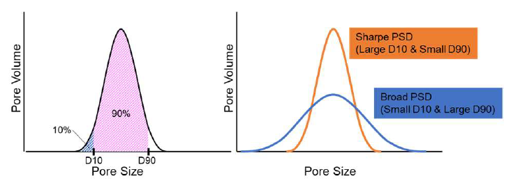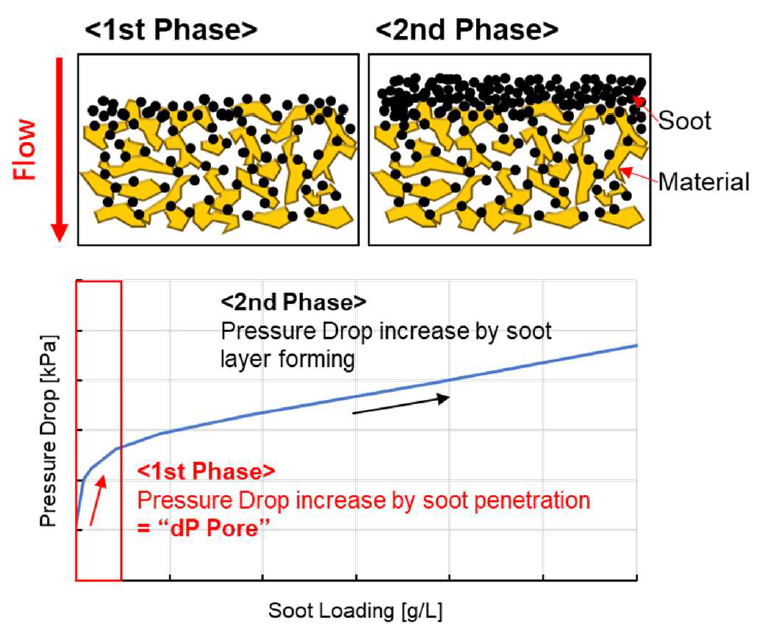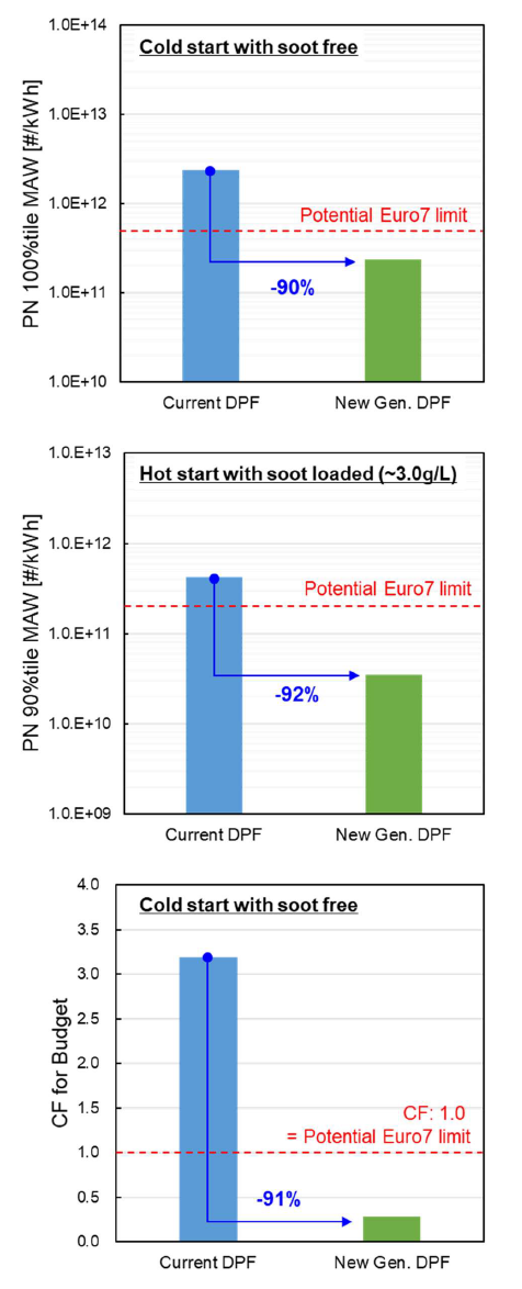 三井ら(2)は高い捕集性能と低い圧力損失を両立させた次世代型ディーゼルパティキュレートフィルタ(DPF)の開発について発表した。図4に示すDPF内のガス流れシミュレーションを実施した結果、材料の大細孔を通ってすすが漏れているため捕集性能を上げるためには材料の大細孔を減らす必要があることが分かった。圧力損失低減に関しては図5に示すすす堆積時の圧力損失の挙動から、図中のdP Pore(すすが基材に侵入した際に生じる圧力損失の急上昇部分)を最小にする必要がある。そのためには小細孔を減らすことが有効である。大細孔量と小細孔量の指標として、図6に示す細孔径に対する細孔容積の分布図から定義したD90とD10をそれぞれ採用した。現行品と比較してD90が小さくD10が大きい次世代型DPFの材料を選定し、これにセル構造の検討を加えて設計した次世代型DPFを使ってエンジンベンチでPN試験を行った。その結果をFig.7に示す。PN排出量は現行DPFより約1桁低くなり、予想されるEuro7の規制値以下となった。