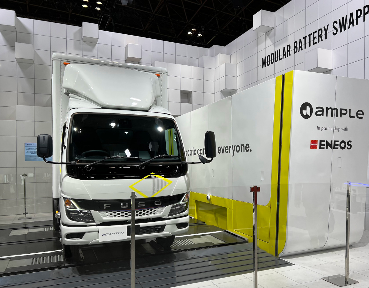 - バッテリEVトラックの変化球。床下に設置したバッテリーユニットごと5分で交換できるシステム。充電の待ち時間をなくすことで車両の稼働率と航続距離の向上を目指す。(渡邊)