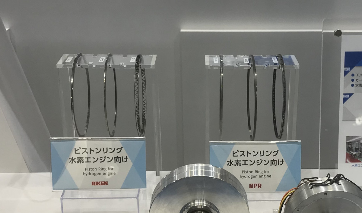 - 水素エンジン化に向けた対応として、水素脆化、燃焼時における多量の水の生成、吹抜け等に対応したピストンリングの研究開発品が展示されている。(飯島)