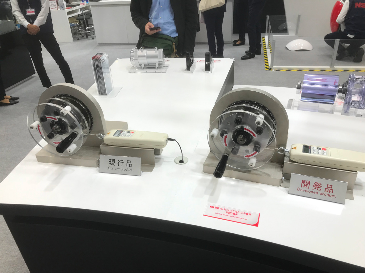 - 車の燃費、電費を良くするために、フリクションを低減したホイールハブ。手回しで回転させた際の反モーメントを、ある腕の長さの位置にて荷重計で測定した数値が表示されており、摩擦の低減効果が良くわかる。ベアリングの密封装置の接触摩擦、グリス等を改良して摩擦を下げているようで、従来品に比べて3割程度の摩擦低減効果があるとのこと。全ての車両のエネルギー効率向上に寄与する地道で重要な技術だと思う。(飯島)