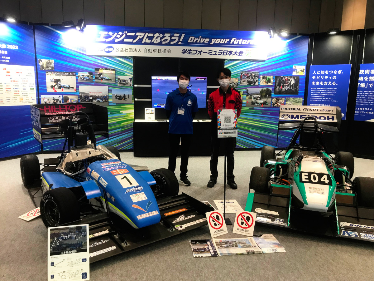 - 学生が自ら設計製作した学生フォーミュラマシン(ICEV及びEV)の展示、開発に取り組んでいる学生たちが説明を担当している。車両は京都工芸繊維大学(左:エンジン)及び名古屋大学(右:EV)。(飯島)