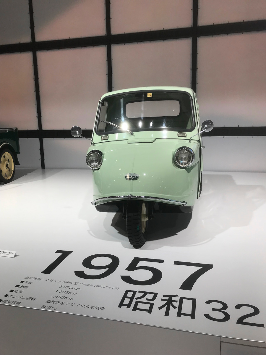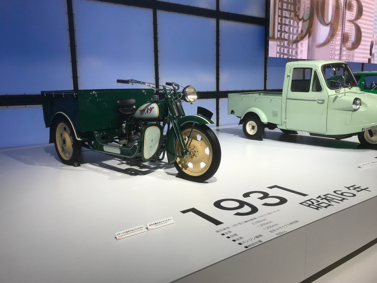 - 498 ccの4ストローク空冷単気筒エンジンを搭載したHD型三輪自動車(昭和6年)と、305 ccの2ストローク単気筒エンジンを搭載したミゼット。歴史的車両の展示も多くあり、楽しめる。(飯島)