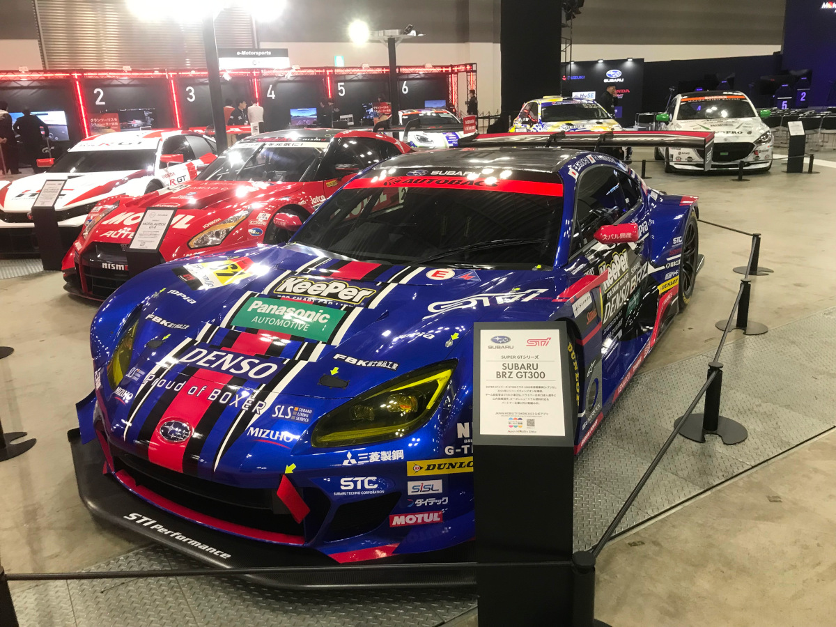 - 2輪、4輪の様々なレース車両(実物またはレプリカ)が展示されている。写真はホンダ製パワーユニットを搭載するオラクル・レッドブルレーシングRB19(2023)、世界耐久選手権(WEC)参戦を見据えたトヨタGR水素エンジン車両、Super GT GT300クラスSUBARU BRZ、Moto GP Repsol HONDA RC213V。モータースポーツエリアの一角にはグランツーリスモ体験コーナーもあり、本物のレーシングマシンを見ながらグランツーリスモも楽しめる。(飯島)