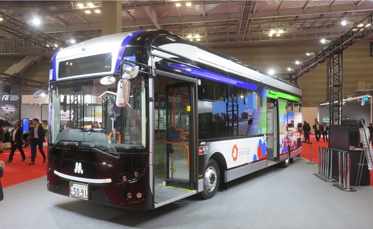 - 東7・8ホールは国内外の新興企業などの様々なEVが勢揃いし、百花繚乱という感じ。その中でEVモータースジャパンでは、大阪府内で運用されている全長10.5mの路線用EVバスを展示。(鈴木)