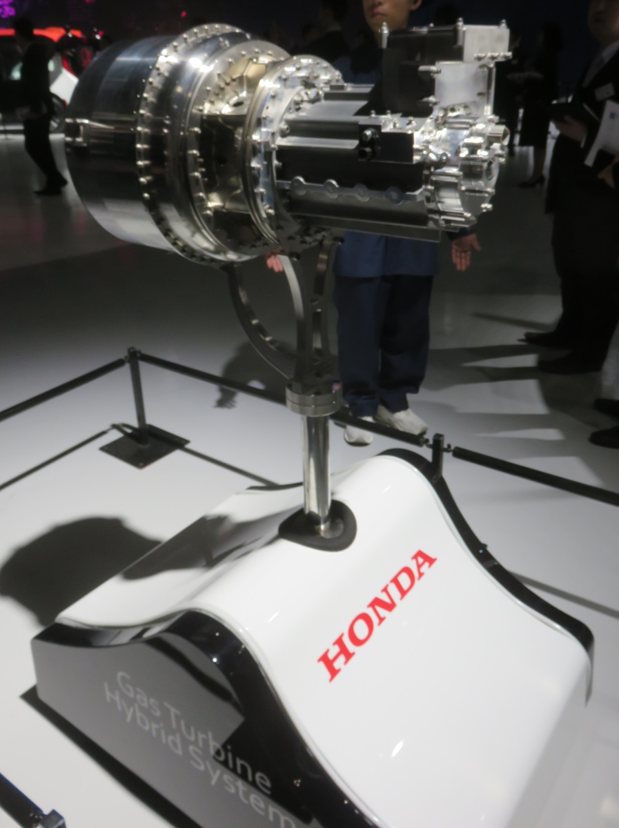 - 数少ない熱機関を展示の中で、ホンダでは空飛ぶ車の航続力延伸を目的としたガスタービンハイブリッドシステムを展示。シリーズ式ハイブリッドで、ガスタービンは発電専用で動力エネルギーの供給や充電に用いられるとのこと。(鈴木)