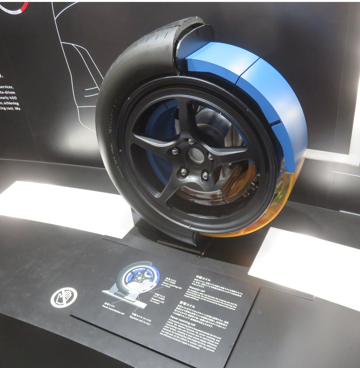 - 走行中ワイヤレス給電の受電コイルをタイヤ、ホイール内に組み込んだ。概念自体は既出であるが、展示品ではホイール内側の受電コイルと路面の間を取り持つ中継コイルを、ホイール内側とともにその外側のタイヤ内に組み込むことで送電コイルのある路面と近接させて受電効率向上につなげるとともに、タイヤ内部に鉄など金属を使わないことで送電の安全性を高めたとのこと。(鈴木)