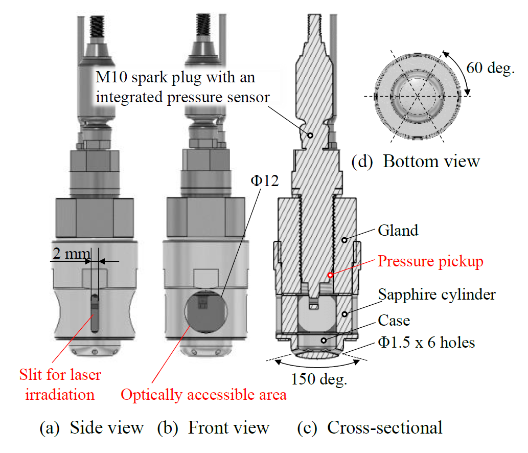 図1に示すように、副室内にレーザ光照射用と画像取得用の観測窓を設けたパッシブ型可視化副室を用いて、単気筒エンジン運転中の計測を行った。測定項目と条件を表1に示す。エンジンおよび副室の仕様は「排気量662.5 cm3, 圧縮比10.2、副室容積割合2.45%、噴口径φ1.5、6噴口」である(詳細は本論文参照)。