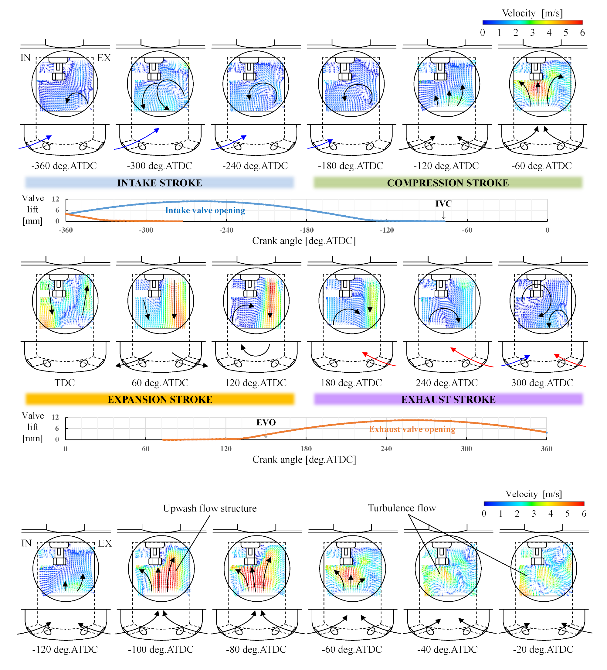 図2に副室内流動をPIV(粒子画像流速測定法)で計測した結果を示す。吸気バルブ開き時に連絡孔から流入した吸気流によって反時計まわりの流動が形成され、その後ピストン圧縮により主室内混合気が副室に流入、膨張行程では副室から主室に向かう流れが観察される。また、副室内に計測の都合上存在するデッドボリュームによるものと思われる流れも観測されており、副室内の形状が主室燃焼にどのような影響を与えるのかを明らかにするうえでも有効な実験だと思われる。このほか、副室内自発光撮影と指圧解析により一連の燃焼過程における副室内火炎輝度、副室内での火炎の進行度合い、副室と主室の圧力差そして主室圧力で計算した熱発生率の関係をもとに、副室燃焼の基本的特性が、火炎画像を元に説明されている(詳細は原著を参照)。