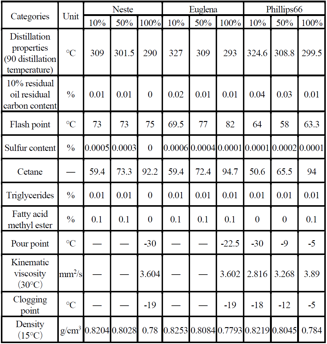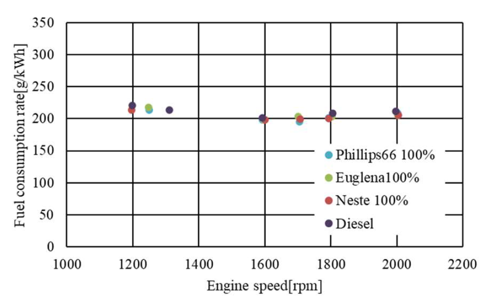奥野ら(1)は、鉄道総合研究所とJR7社の協業による「鉄道車両におけるバイオディーゼル燃料の導入に向けた技術開発」の取組みの中で、HVOが鉄道運行に支障なく安全に使用できることを確認する試験を実施している。供試燃料は3社(Neste, Euglena, Phillips66)のHVOを、ベース軽油との混合率を変えた9種とした(表1)。HVOは流動点と目詰まり点でJIS規格を外れる燃料が有り、低温時始動やエンストの懸念がある。実験は、台上試験機において、列型ポンプ式のコマツ製11L-L6エンジン(表2)を用いて出力、燃費、排出ガスを測定した。出力(図1)と燃費(図2)は軽油同等、排出ガスはNOxに若干の差が見られる条件もあるものの同等レベルといえるため、鉄道車両への適用を目指していく。