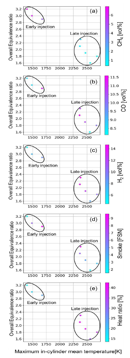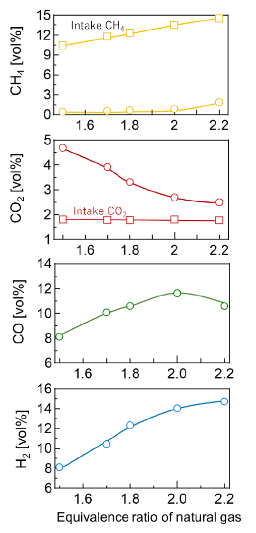 本間ら(2)は、メタンと二酸化炭素を改質し、水素と一酸化炭素を取り出すドライリフォーミング反応を、高温場となるエンジン筒内で起こすことで、温室ガス回収と出力の同時発生の技術構築に挑戦した。実験は、直噴ディーゼルエンジンの吸気管からメタン濃度89vol.%の天然ガスと二酸化炭素を吸入させた。反応は、当量比の増加に対し二酸化炭素の生成割合が減少していることで確認できる。当量比2.2では、熱分解反応の関係から、水素の生成割合が一酸化炭素の生成割合よりも多くなる(図3)。一方で、当量比の増加はスモークの悪化を招くため、噴射時期を進角させた。進角した際の早期着火の安定性のため、軽油と二酸化炭素を増加させたことが、筒内温度の低下を招き、ドライリフォーミング反応が進行しにくくなった。以上より、スモーク排出と改質ガス生成のトレードオフを脱する技術の模索が今後は必要である(図4)。