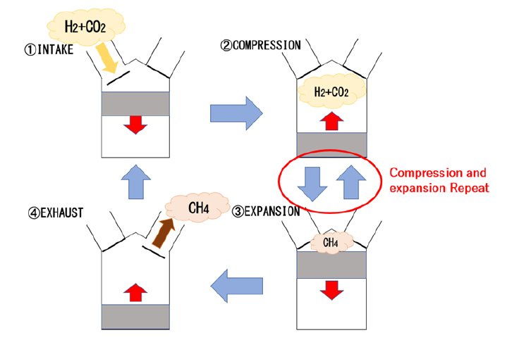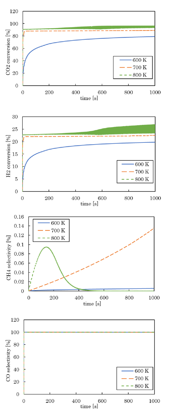 松浦ら(1)は、内燃機関を模擬した無触媒メタネーション反応器(図1)を提案し、その有効性と最適な運転条件を検討するため、Chemkin-Ⅱ(2)のICENを用いて0次元シミュレーションを行っている。メタネーションは、二酸化炭素と水素からメタンを合成する技術(CO2+4H2=CH4+2H2O)で、通常の反応器では触媒を使用するため、触媒が熱劣化するという課題が有る。しかし今回の提案では、触媒を用いないため、大幅なコスト削減が可能になるとのこと。本研究では有利な条件を議論するため、CO2(H2)転換率とCH4(CO)選択率を用いて、初期温度(図2)、初期組成、圧縮比、回転数の影響を検討している。メタン生成の反応速度を大きくするには、初期温度、水素の割合、圧縮比、回転数を増加させればよい。ただしメタンの生成量を多くするには、低温・高圧が有利であるため、初期温度はある程度低く、またSabatier反応の量論比に近い組成が良いと報告があった。再生可能エネルギーの余剰電力を利用して水素を製造し、発電所等から回収した二酸化炭素を活用するメタネーションにより合成される燃料は、カーボンニュートラル燃料である。
