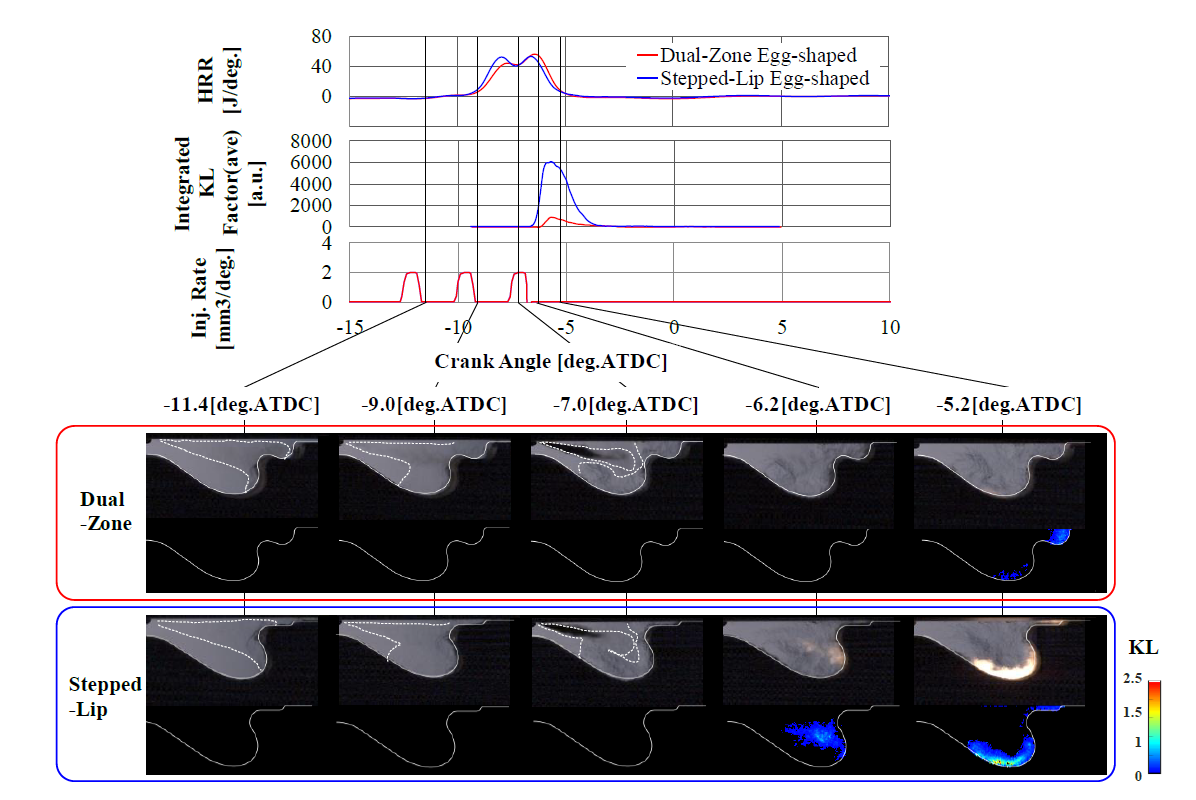 本論文は、著者らが提案している二段エッグ燃焼室(Dual Zone Egg-shape Combustion Chamber)を用いた空間制御予混合燃焼(Distribution Controlled partially Premixed Compression Ignition: DCPCI)のコンセプトを可視化実験と数値解析により検証している。図1は二段エッグ燃焼室を二次元的に模擬し、RCEMを用いて三段噴射時における燃焼過程を可視化した結果である。従来燃焼室(Stepped-Lip Egg-Shaped Bowl)では、一段目と二段目の噴霧が三段目の噴霧と干渉し、輝炎が発生している。二段エッグ燃焼室では、一段目と二段目の噴霧が燃焼室の上下に分配され、三段目の噴霧との干渉が低減されて輝炎の発生が抑制されている。これらは数値解析でも再現されている。DCPCI燃焼は燃焼室形状と噴霧配置の最適化で、sootの少ないリーン燃焼を実現しているといえる。