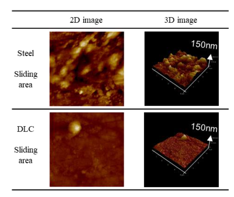 岩田ら(2)は、自動車用エンジンのクランクシャフトとすべり軸受け間の摩擦低減を目的として、DLCジャーナルによる流体潤滑領域での摩擦低減メカニズムの検証を行っている。実験では、焼付き試験後のジャーナルおよび軸受の表面性状を、Atomic Force Microscopy で計測した。その結果、DLCジャーナルと摺動した軸受では、鋼ジャーナルと摺動した軸受および未使用の軸受に比べて、ナノスケールで平滑な表面が形成されており、流体潤滑領域での摩擦低減効果の一因は、軸受表面の微小な突起が研磨されたことに起因する可能性が示された。