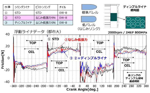 浮動ライナエンジンでの摩擦低減効果の評価クランク角度毎のピストン系の摩擦力計測が可能なFLEによる実験結果の例を図4に示す(9)(10)。標準バレル(張力14N)のピストンリングの摺動面形状を低バレル(なじみ形状+張力9N)にした場合、行程中央および上下死点付近において10N近くに及ぶ大幅な摩擦低減効果が得られた。シリンダライナへディンプルを付与すると低バレルリングとの相乗効果で摩擦が更に低減した。この他、リング張力は同じでバレル形状のみを変えた場合にも、低バレル形状のピストンリングはオイル粘度を0w-20から0w-8に下げた場合と同等の摩擦低減効果が得られており、LOCとのバランスを考慮した上で、積極的な流体潤滑の発生を促すしゅう動面の導入が摩擦低減に効果的であることが分かっている。